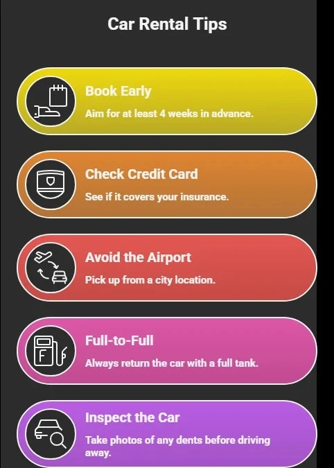 💡 Pro Tip: Booking a weekly rental instead of 5 days can sometimes give you 2 extra days for free.